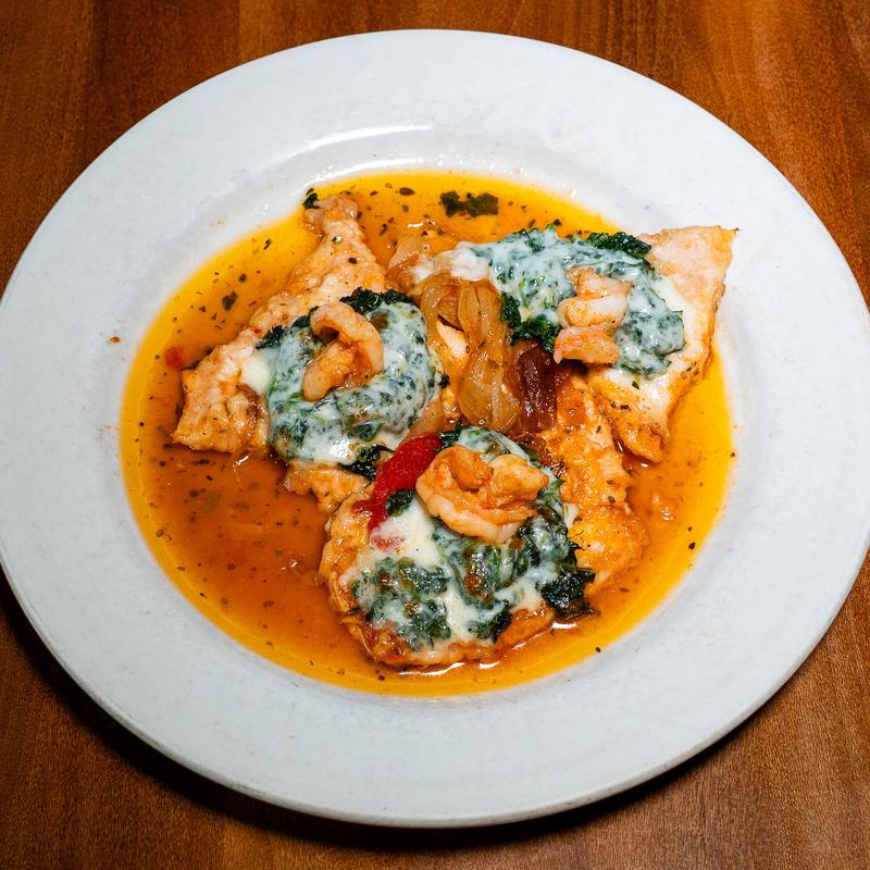 Chicken $26.95 | Veal $30.95 • Chicken with spinach, mozzarella cheese, and shrimp in a wine sauce